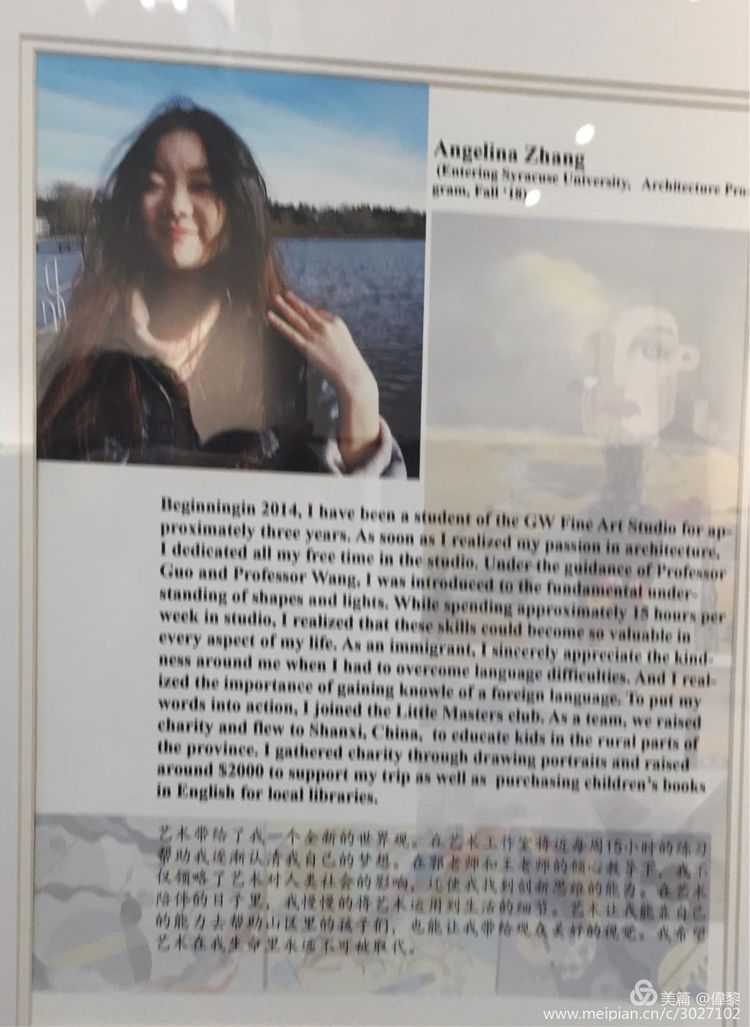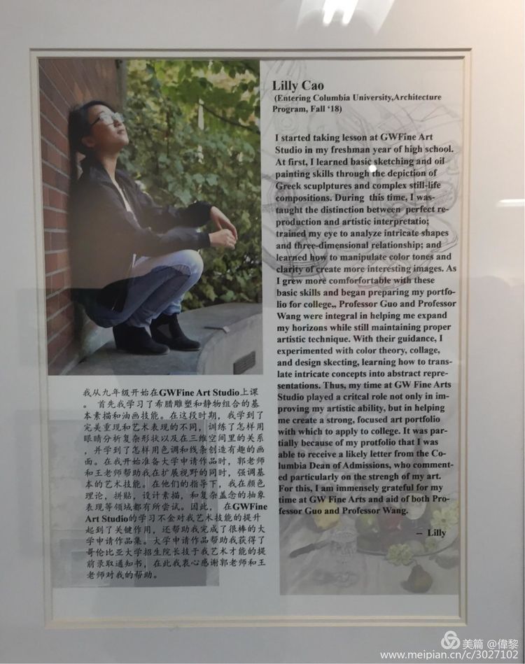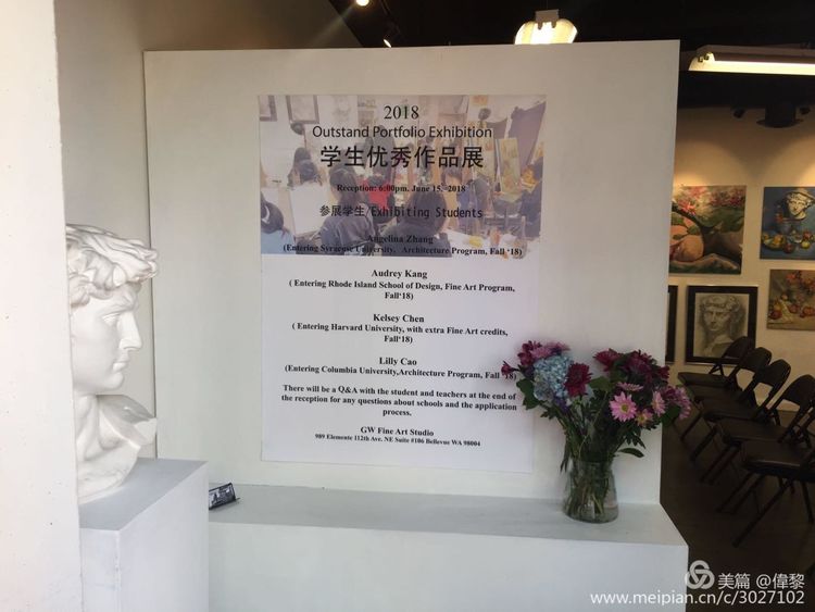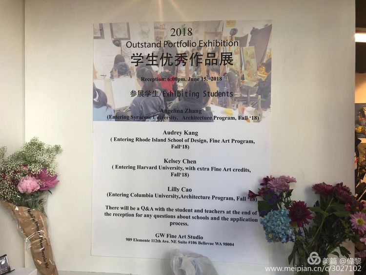 2018 年度GW工作室杰出学员作品展于6月15日晚6:00 在华州Bellevue 市中心的工作室原址如期举行。今年共有八位学员完成并递交了绘画作品集( Portfolio), 他们分别考入了以下大学: